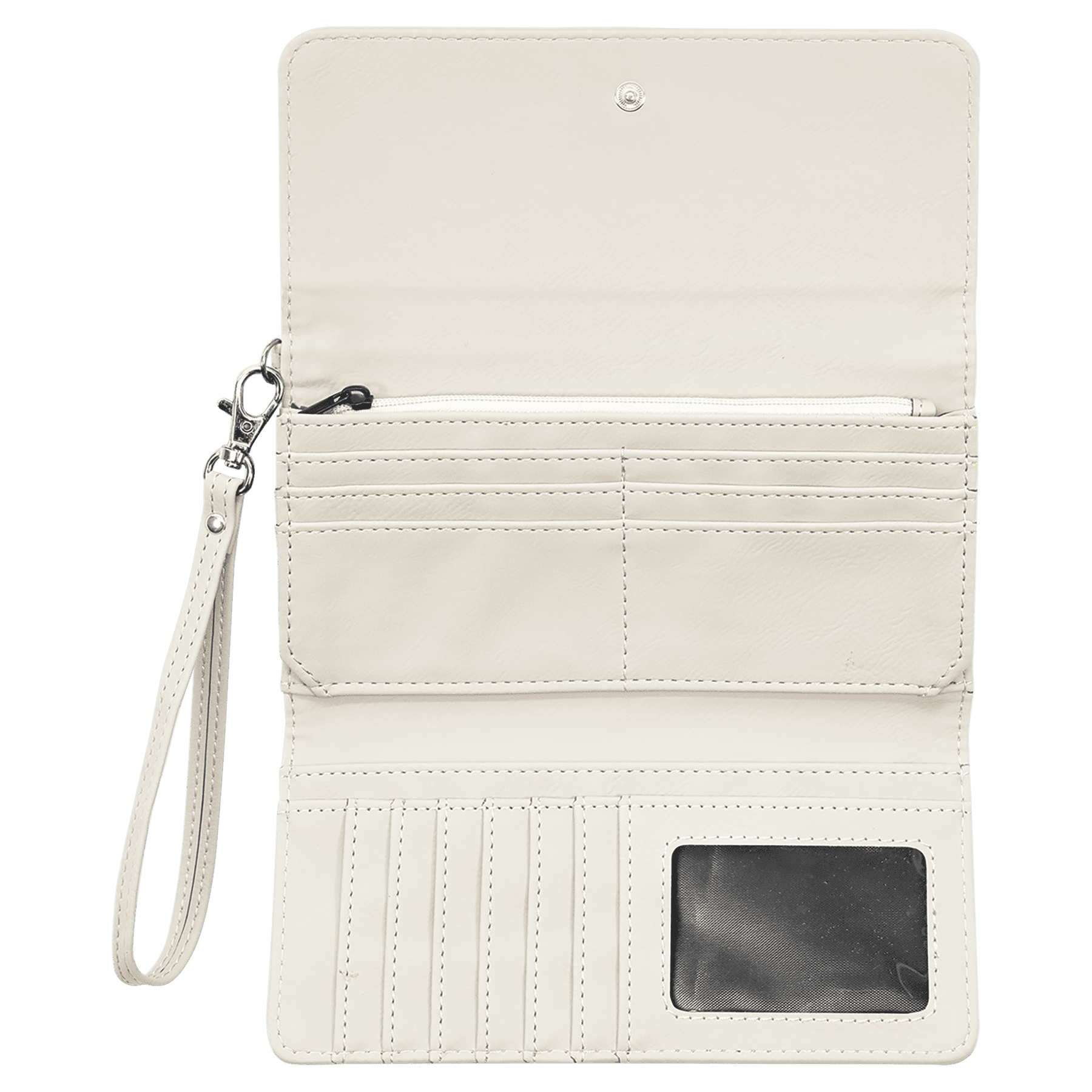 This attractive leatherette wallet has slots for 12 cards plus an ID and features RFID protection. There is a zipper compartment for change a larger compartment for bills, and 2 smaller compartments for receipts, etc. It comes with a detachable wrist strap and has a secure snap closure and topstitching all around gives it a nice, high-end finish. Available in eight stunning colors, it can be personalized to a bold contrast to create a beautiful gift or incentive for any occasion.